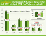 Im Unterschied zur globalen Entwicklung ist der Inlandsabsatz stickstoffhaltiger Düngemittel in der laufenden Düngesaison (Juli 2011 bis April 2012) im Vergleich zum Vorjahr um etwa 10 % zurückgegangen. Mit Blick auf die gesellschaftliche Akzeptanz moderner Landwirtschaft betonte IVA-Präsident Jachmann, dass in der Diskussion um Pflanzenschutz die Risiken überbetont, der Nutzen hingegen leichtfertig übersehen werde. Er verwies dabei auf die ersten Ergebnisse eines Forschungsvorhabens an der Humboldt-Universität zu Berlin, das der IVA seit 2011 fördert.