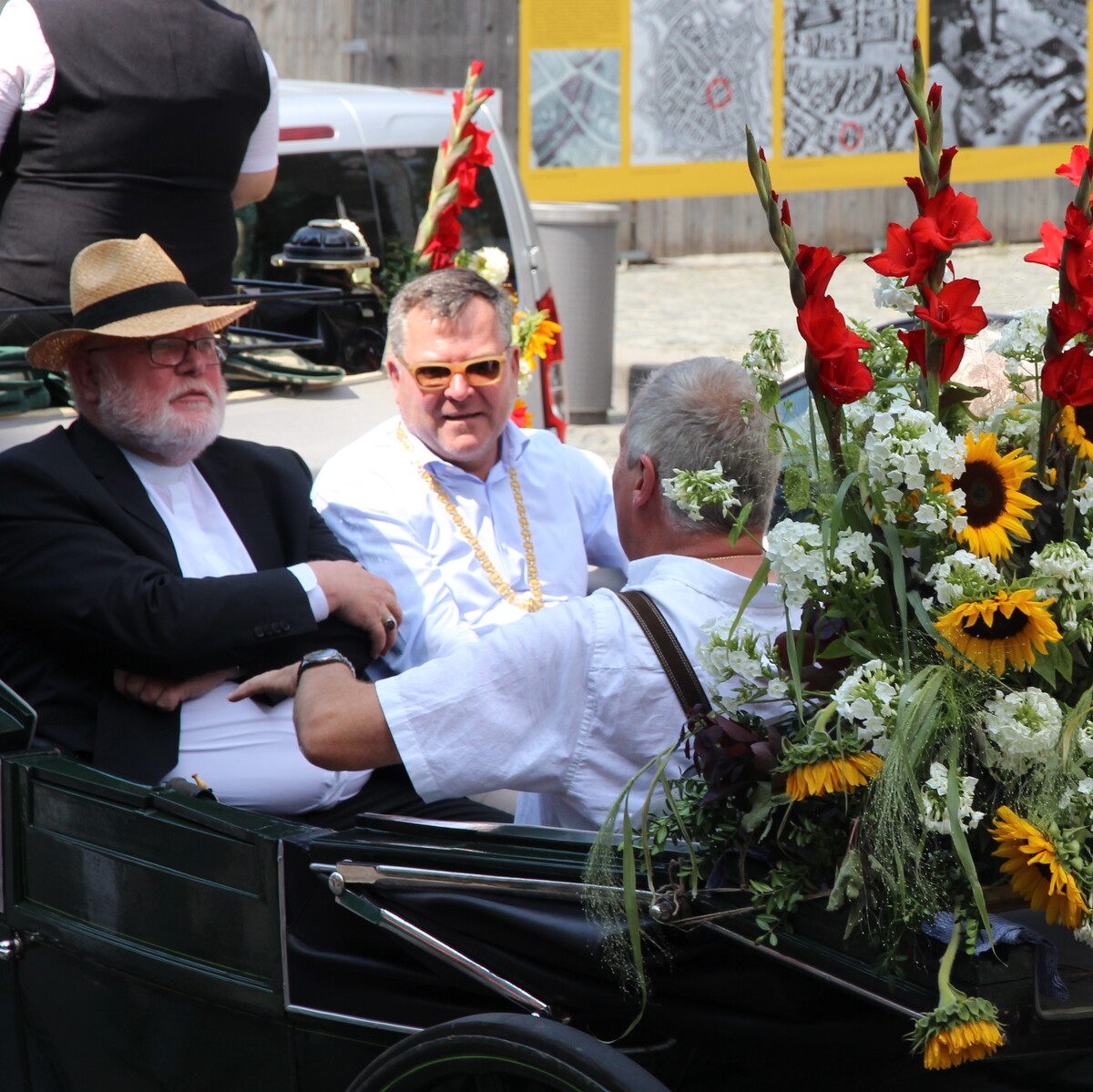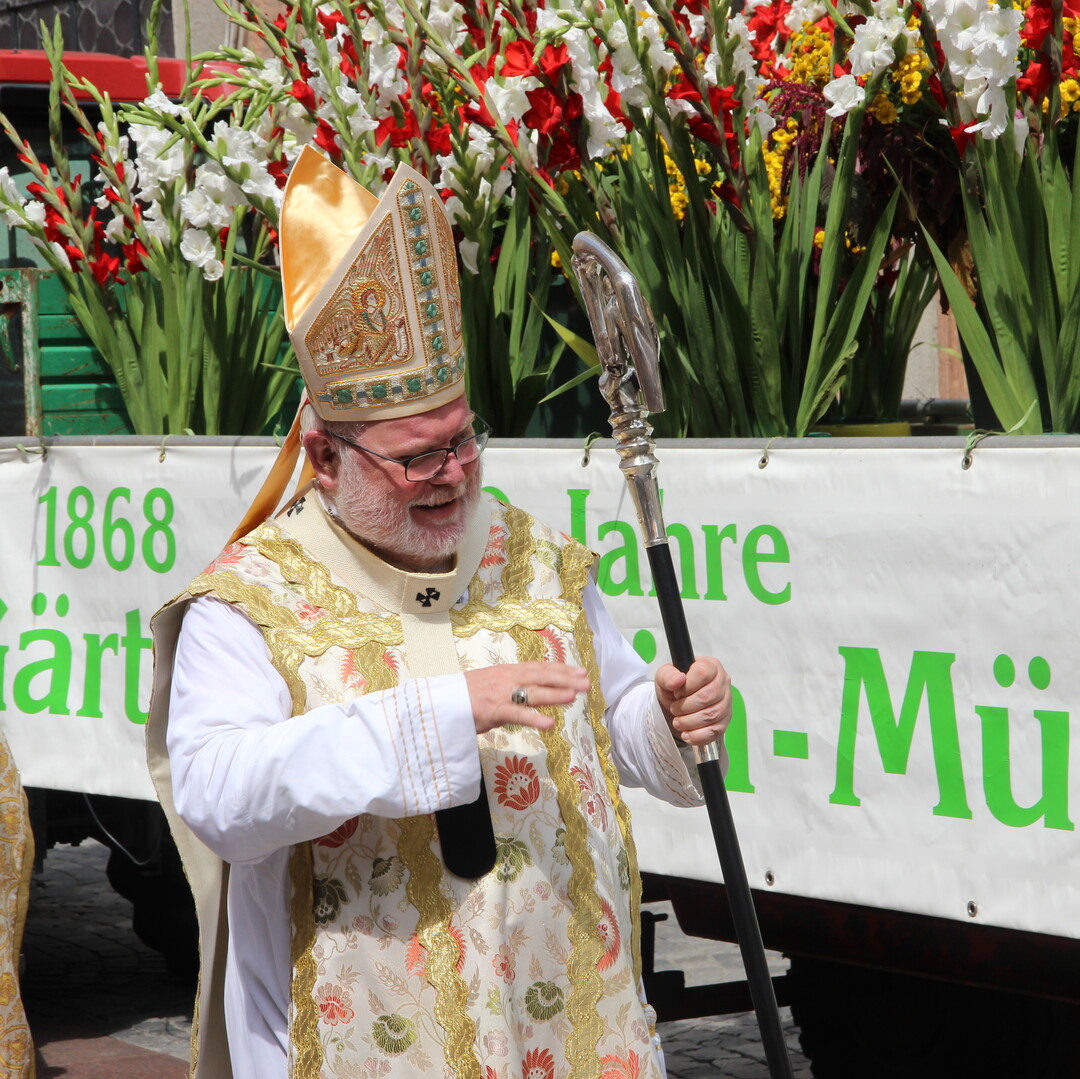 Am Umzug der Blumenwagen nahmen auch Münchens Oberbürgermeister Dieter Reiter und der katholische Kardinal Reinhard Marx teil, der den Gottesdienst im "Alten Peter" leitete.