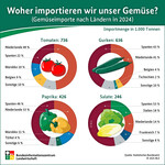 von BZL erschienen am 21.08.2025Die mit Abstand wichtigsten Lieferländer sind Spanien und die Niederlande. Besonders auffällig ist das bei Gurken: Rund 84 % der importierten Gurken kommen aus diesen beiden Ländern. Mengenmäßig sind Tomaten das wichtigste Importgemüse. 2024 wurden rund 736.000 t nach Deutschland eingeführt – fast die Hälfte davon aus den Niederlanden. Tomaten sind das beliebteste Gemüse hierzulande, aber nur etwa 12 % der Frischware stammen aus heimischem Anbau. Nimmt man auch verarbeitete Tomatenprodukte hinzu, sinkt der Anteil sogar bis auf knapp 4 %. Anders sieht es beim Salat aus: Mehr als die Hälfte des hierzulande verbrauchten Salats wird von der heimischen Landwirtschaft angebaut. Die für den deutschen Markt zusätzlich benötigten Salate werden zu 71 % aus Spanien und Italien importiert.