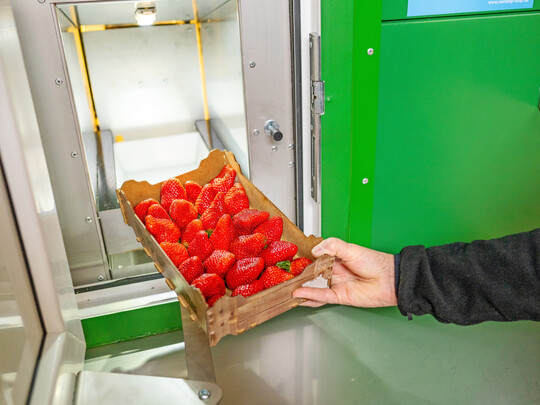 Die geeichte Waage von NonStop Shop wiegt auf Wunsch jeden Inhalt der 430 Produktschalen unmittelbar vor Ausgabe. Das heißt, dass lose Waren wie Erdbeeren, Spargel oder Fleisch vom Befüller nicht vorher von Hand abgewogen werden müssen. Außerdem: Selbst bei gekühlten Produkten entstehen Verdunstungsverluste. Vor allem bei Beeren und Spargel können diese erheblich sein. Um beispielsweise 500 g Erdbeeren an den Kunden zu geben, müssen 8 bis 12 g dazu kalkuliert und damit „verschenkt“ werden. Diese Verluste werden mit der Waage eliminiert. Für den Kunden und Betreiber wird grammgenau abgerechnet.