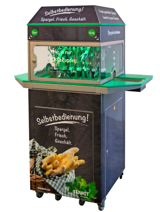 Der TENRIT SCHÄLMASTER MINI zeichnet sich durch eine kleine Aufstellfläche von nur 0,38 m2 bei gleichzeitig hoher Schälleistung von 1 kg in 20 Sekunden aus. Die Bedienung erfolgt durch den Endkunden, der Stange für Stange in die Maschine einführt. Über insgesamt zwölf Messer wird der Spargel sauber geschält und auf der gegenüberliegenden Seite in einer Auffangschale aufgefangen. Der Schälbereich ist von drei Seiten sichtbar. Durch die Arbeitshöhe von einem Meter können auch Kunden mit Handicap die Maschine nutzen. Am Standort benötigt die Maschine lediglich einen 230 V-Stromanschluss. Unter der Maschine befindet sich ein verschiebbarer Wagen, der Spargelschalen und Brauchwasser auffängt. Zusätzlich findet auf dem Wagen ein 20-Liter Frischwasserkanister Platz. Zur Inbetriebnahme wird der Wagen aus der Maschine gezogen und zu einem Wasserhahn gefahren. Über die Innenbeleuchtung der Maschine kann der Betreiber jederzeit den Status der Maschine erkennen: Bei grünem Licht ist die Maschine einsatzbereit, bei blauem Licht muss das Wasser aufgefüllt werden, bei rotem Licht ist die Maschine nicht einsatzbereit. Zum Reinigen können alle Bauteile in der Maschine verbleiben.