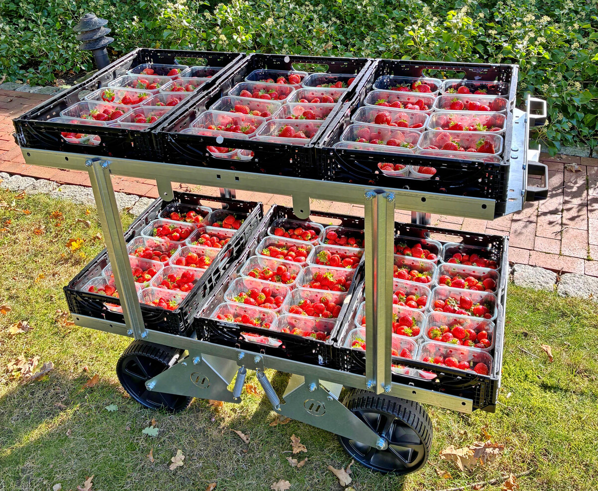 Heuling stellt ein innovatives Federungssystem für Transportwagen vor, das speziell für den Einsatz in Folientunneln entwickelt und exakt auf die besonderen Anforderungen unebener Tunnelböden zugeschnitten wurde. Durch die Federung werden Druckstellen und Qualitätsverluste an den empfindlichen Erdbeeren vermieden. Die Wagen können schneller und ohne Unterbrechungen zum Ende des Tunnels geschoben werden, was Zeitersparnis bedeutet. Erntehelfer können die Erdbeersteigen von allen Seiten auf den Wagen stellen, was für eine schnellere und effizientere Beladung sorgt. Dieses Federungssystem bietet nicht nur einen deutlichen Mehrwert für die Qualität der Ernte, sondern auch für die Effizienz des gesamten Ernteprozesses. Die Technologie wurde in verschiedenen realen Tests erfolgreich erprobt und hat sich laut Hersteller als äußerst robust und funktional erwiesen.