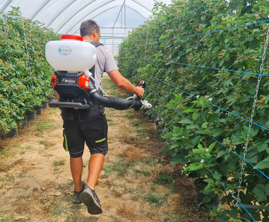 Bioline Agrosciences hat 2025 sein neues Präzisionssprühgerät für Raubmilben, Sprayvent, auf den Markt gebracht. Es handelt sich laut Herstellerangaben um das weltweit erste System, das speziell zum präzisen und effektiven Versprühen von Raubmilben wie Phytoseiulus persimilis in flüssiger Phase entwickelt wurde. Das Sprühgerät kombiniert das patentierte Verfahren des sicheren Transfers von Raubmilben sowie anderer Nützlinge in flüssige Phase mittels neuartiger Flüssigformulierung, welche Milben (aber auch Eier, Puppen und Nematoden) im Tank in Suspension hält, ohne dass diese sich in der Flüssigkeit absetzen. Zudem wird die flüssige Raubmilbenformulierung mit der patentierten Düse präzise, schonend und zugleich effektiv in Pflanzenbeständen verspritzt. Es bietet eine effektive, gleichmäßige und schlagkräftige Ausbringungsvariante von Raubmilben, was Gärtnern Zeit und Geld spart und Ressourcen schont.