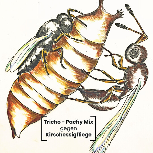 Tricho-Pachy-Mix ist laut Hersteller eine hochwirksame, natürliche Lösung zur biologischen Bekämpfung von Fruchtfliegen (Drosophila spp.) im Beerenanbau. Das Produkt vereint zwei spezialisierte Puppenparasitoide: Trichopria drosophilae und Pachycrepoideus vindemiae, die gemeinsam populationsunterdrückend auf Drosophila melanogaster und verwandte Fruchtfliegenarten wirken. Trichopria drosophilae ist ein ursprünglich aus Ostasien stammender Endoparasitoid, der mittlerweile in Europa etabliert ist und sich besonders wirksam gegen Drosophila suzukii und andere Drosophila-Arten erwiesen hat. Weibchen parasitieren Fliegenpuppen im Fruchtkörper sowie am Boden. Pachycrepoideus vindemiae ist ein weltweit verbreiteter Ektoparasitoid, der auch bei kühleren Temperaturen aktiv bleibt und Trichopria drosophilae ergänzt, indem er Puppen in anderen Mikrohabitaten parasitiert und so hohe Gesamtparasitierungsraten sicherstellt. Durch diese sich ergänzenden Verhaltensweisen werden sowohl Puppen in den Früchten als auch auf dem Boden gezielt erfasst, mit durchgängig hohen Parasitierungsraten von bis zu 87,5 % in Versuchen.