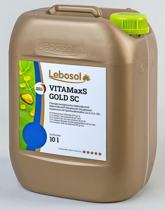 Mit über 30 Jahren Erfahrung in der Pflanzenernährung präsentiert sich die Lebosol Dünger GmbH als beratungsstarkes und forschendes Unternehmen. Die neueste Entwicklung ist eine kupferfreie Premium-Formulierung mit dem Namen Lebosol-VITAMaxS GOLD SC. Das Produkt ist eine ausgewogene Kombination der Nährstoffe Schwefel, Mangan, Zink, Bor und Calcium. Durch seinen Einsatz wird gezielt die Vitalität und die pflanzliche Widerstandskraft gegenüber Umweltstress gestärkt, um die Erträge unter unterschiedlichsten Bedingungen zu stabilisieren.