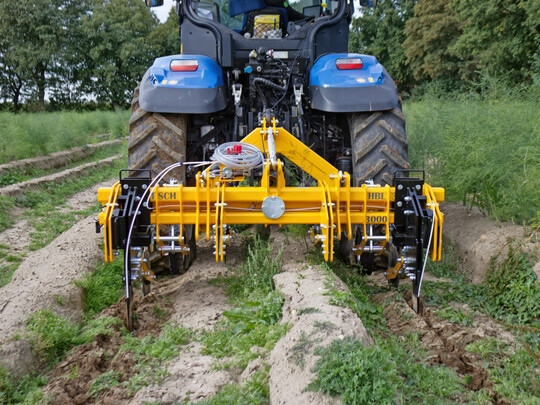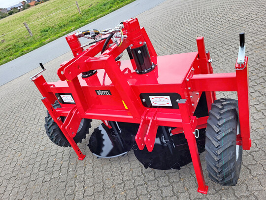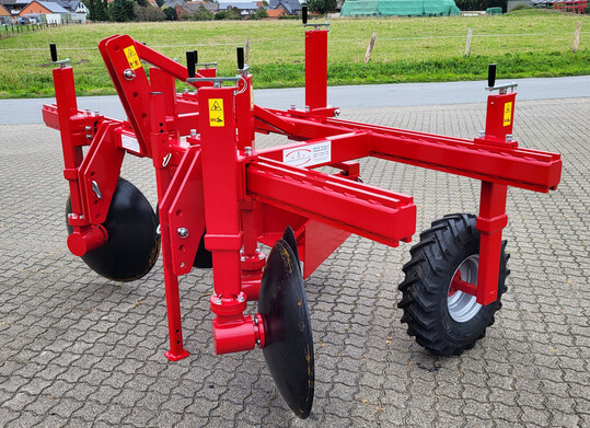 Den Scheibenpflug 4 führt Hermeler Maschinenbau auf der expoSE in den Markt ein. Er verfügt über zwei sehr stabile Träger-Vierkantrohre und ist im Front- und Heckanbau einsetzbar. Das vordere Vierkantrohr ist mit zwei glatten und zwei gezackten Scheiben in verschiedenen Größen, die jeweils stufenlos höhenverstellbar und drehbar sind und via Schiebestück auf dem Rohr in die gewünschte Position gestellt werden können, ausgestattet. Das hintere Vierkantrohr ist mit einem keilförmigen Verteilkörper, der stufenlos in Höhe und Neigungswinkel einstellbar ist und via Schiebestück auf dem Rohr in die gewünschte Position gestellt werden kann, bestückt. Der Keil zerstört den Damm und die Scheiben verteilen dessen Erde anschließend. Zusätzlich verfügt der Scheibenpflug über zwei stufenlos höhenverstellbare Stützräder zur Tiefeneinstellung. Der Scheibenpflug ist vielseitig einsetzbar: zum Abdämmen nach der Ernte, Vordämmen, Entfernen von Erd- und Pflanzenresten auf dem Damm, Erstellen von Winterdämmen und zur mechanischen Wildkrautregulierung.