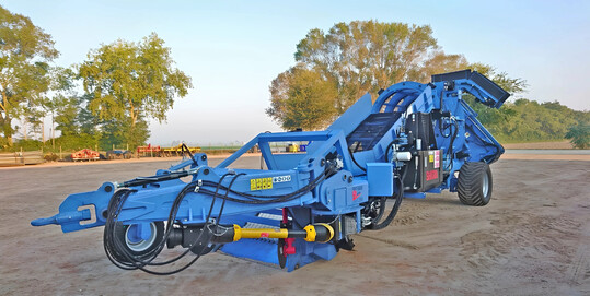 Zur Bekämpfung von Spargelfliege und Pilzbefall wird im Herbst das Spargelkraut von den Dämmen entfernt. Der neu entwickelte Krautabschneider BÜFFEL konnte bereits 2024 vorgestellt werden. In diesem Jahr präsentiert er sich mit folgenden Weiterentwicklungen: Front- oder Heckanbau sind möglich durch die Integration von zwei Dreipunktrahmen. Das macht die Einsatz- und Kombinationsmöglichkeiten flexibel, auch mit anderen Bodenbearbeitungsmaschinen zur Minimierung von Arbeitsgängen. Hydraulischer Antrieb der Messerscheiben mit veränderbarer Drehrichtung, sodass mögliche Verstopfungen von Pflanzenresten durch Änderung der Drehrichtung leicht beseitigt werden können. Ein Keil, mittig platziert zwischen den beiden hydraulisch betriebenen Messerscheiben, verteilt Spargelkrautabschnitt und Bodenmaterial seitlich neben dem Damm. Dieser keilförmige Verteilkörper ist sowohl in der Höhe als auch in der Neigung verstellbar, um eine optimale Ausrichtung zum Damm zu schaffen. Es kommt zu keinen Anhäufungen von Krautabschnitt oder anderem Bodenmaterial auf dem Damm und erleichtert die Aufnahme des Krautabschnitts.