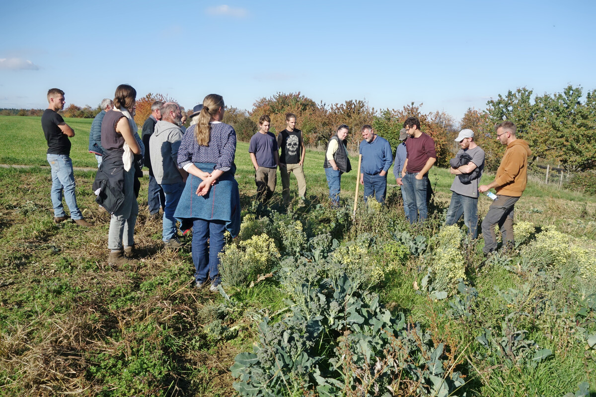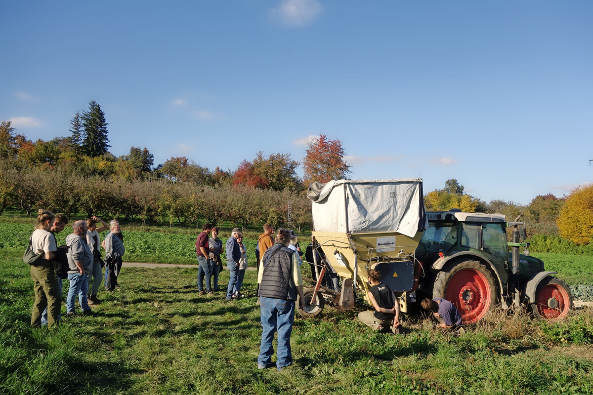 von Beate Leidig, Projektkoordinatorin Humusaufbau in der Landwirtschaft erschienen am 27.10.2025Natürlicherweise ist lebendiger Boden mit einer Streuschicht oder von Pflanzen bedeckt. Im Gemüsebau sind jedoch üblicherweise eine intensive Bodenbearbeitung und das Hacken der Kulturen weit verbreitet. Der Gemüsebauer und Tüftler Jonathan Gruel aus Owen und Gemüsebauberater Patrik Weinmann haben umfangreiche Erfahrungen mit dem Mulchanbau von Gemüse, die sie gerne weitergaben. Sie zeigten Kulturen mit verschiedenen Verrottungsstadien des Heumulchs sowie den vom Tüftler Jonathan Gruel entwickelten Mulchomat zu dessen Ausbringung.