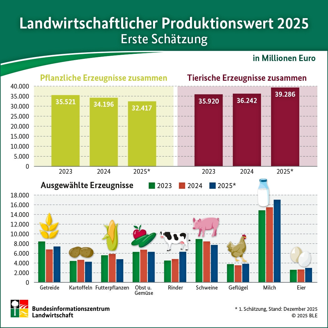 von BLE erschienen am 06.01.2026Für das positive Ergebnis sorgten insbesondere die gestiegenen Preise im Bereich der Tierproduktion – die Veredlungswirtschaft steuerte mit 39,3 Milliarden Euro erstmals mehr als die Hälfte (51,1 %) zum gesamten landwirtschaftlichen Produktionswert bei. Im Pflanzenbau war der Produktionswert dagegen rückläufig.
