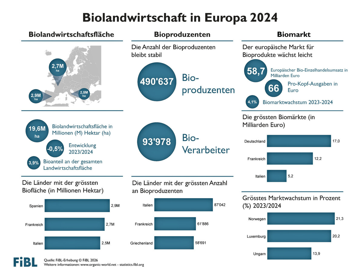 Auch 2024 war Deutschland der größte Biomarkt in Europa (17 Mrd. Euro), gefolgt von Frankreich (12,2 Mrd. Euro) und Italien (5,2 Mrd. Euro). Die Bioeinzelhandelsumsätze erreichten 58,7 Mrd. Euro (Europäische Union: 49,5 Mrd. Euro) und stiegen um 4,1 % in Europa und um 3,6 % in der Europäischen Union. Die Schweiz verzeichnete 2024 mit 481 Euro pro Person den weltweit höchsten Pro-Kopf-Konsum und mit 12,3 % den weltweit höchsten Biomarktanteil am gesamten Lebensmittelumsatz.