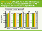 Mit einem Ertragszuwachs von 172 kg/ha pro mm Wassergabe wurde eine nahezu identische Wassereffizienz wie im Vorjahresversuch ermittelt. Eine Wechselwirkung zwischen Sorte und Bewässerung konnte wiederum nicht beobachtet werden. Getestet wurden ‘Hyfort’ (Bejo) und ‘Barito’ (Seminis), die von den Züchtern als eher trockenstresstolerant, ‘Summit’ (Bejo) und ‘Sunnito’ (Seminis),die als weniger trockenstresstolerant bezeichnet wurden. Wie und wann wurden die Zwiebeln bewässert? Die Bewässerungsvarianten im Versuch: Kontrolle ohne Beregnung, Variante „Praxis“(ein bis zwei Wassergaben, sodass der Bodenwassergehalt 40 % nFK nicht unterschreitet) und Variante „Intensiv“...