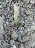 Holzauge sei wachsam! So könnte der Tipp lauten, um große Schäden bei Spargel durch Erdraupen abzuwenden. Die Kontrolle über diesen Schädling ist nur in manchen Jahren überaus wichtig, in denen die Population über das gewisse Level durchschnittlicher Jahre hinaus geht. Wer möchte schon Bilder wie dieses rechts mit einer Erdraupe und total abgefressenem Spargel-Jungtrieb allzu häufig in seinen Anlagen sehen?