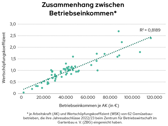 Die Bedeutung der Kennzahl Betriebseinkommen je Arbeitskraft (AK) wird auch aus dem Betriebsvergleich des ZBG ersichtlich. Sie steht in einem sehr engen Verhältnis zu anderen Erfolgskennzahlen wie zum Beispiel dem Wertschöpfungskoeffizienten (WSK), welcher ein Maß für die Rentabilität von Betrieben ist. Ein WSK von >= 1 zeigt an, dass ein Betrieb rentabel wirtschaften kann. In der nachfolgenden Grafik ist der Wertschöpfungskoeffizient in Abhängigkeit des Betriebseinkommens je AK von 62 Gemüsebaubetrieben dargestellt, die ihre Abschlüsse für das Jahr 2022 bzw. 2022/23 beim ZBG eingereicht haben. Mit einem Anstieg der Arbeitsproduktivität nimmt auch die Rentabilität der teilnehmenden Betriebe zu. Aufgrund dieser großen Bedeutung der Nettoarbeitsproduktivität wird beim Betriebsvergleich des ZBG das Betriebseinkommen je AK als Kennzahl verwendet, um die Betriebe nach Erfolg zu gruppieren.