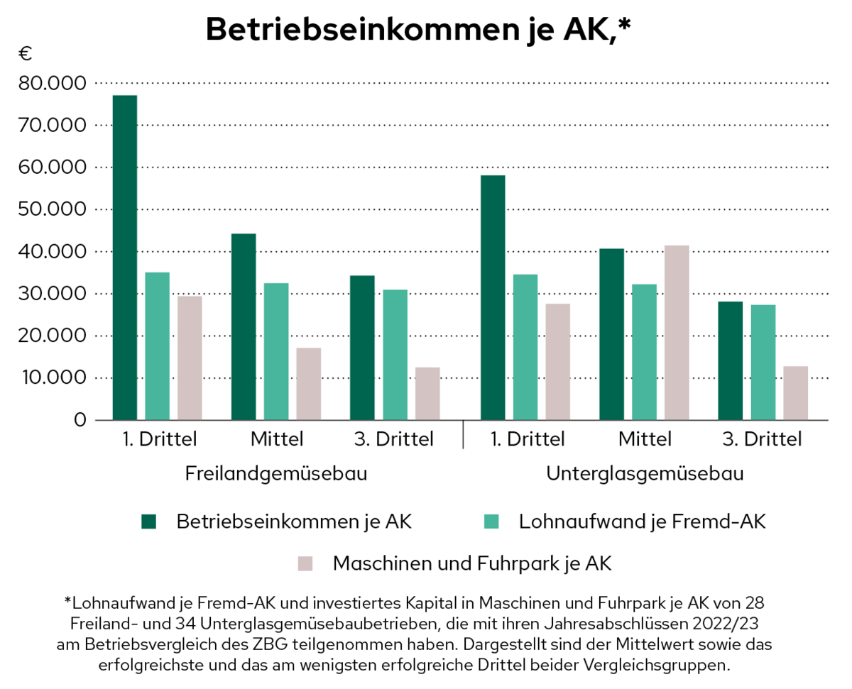 Bei den Betrieben mit der geringsten Arbeitsproduktivität im Freiland ist das Betriebseinkommen mit 25.000 Euro je AK deutlich niedriger als die durchschnittliche Entlohnung von 31.100 Euro je Fremd-AK. Daraus folgt, dass bei diesen Betrieben zu wenig für die Entlohnung der Unternehmerfamilie, geschweige denn für die Verzinsung des eingesetzten Kapitals, übrigbleibt. Diese Schlussfolgerung kann auch beim dritten Drittel des Unterglasgemüsebaus getroffen werden, auch wenn die Zahlen hier noch leicht positiv ausfallen.