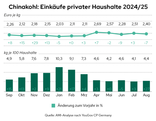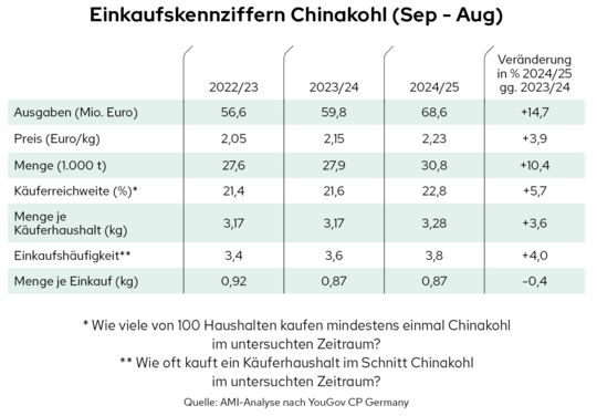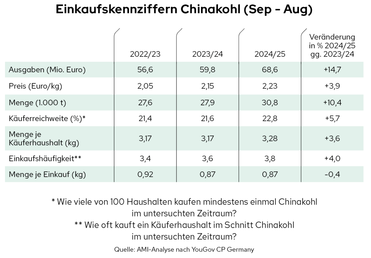 Der Durchschnittspreis für Chinakohl auf Verbraucherebene stieg im Betrachtungsraum, einer AMI Analyse nach YouGov CP Germany zufolge, gegenüber dem Vorjahr um knapp 4 % auf 2,23 EUR/kg. Die Menge je Einkauf war zwar leicht rückläufig bei rund 870 g, der Zuwachs bei der Käuferschaft und das Plus bei der Einkaufshäufigkeit glichen dies aber mehr als aus. Dadurch stieg die eingekaufte Menge 2024/25 um knapp 4 %. Zusammen mit dem höheren Preisniveau legten die Ausgaben der Privathaushalte um 15 % gegenüber dem Vorjahr zu.