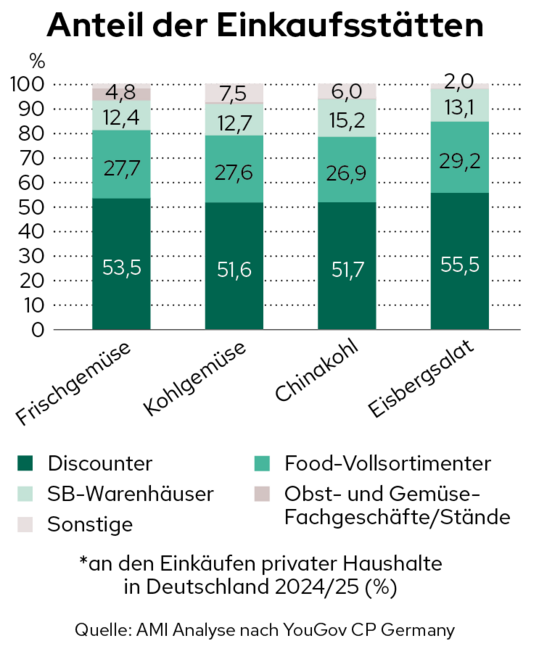 Im Betrachtungszeitraum wurden knapp 52 % der gesamten Chinakohlmenge beim Discounter gekauft. Zur Einordnung: Bei Gemüse insgesamt lag der Anteil der Discounter bei fast 54 %, Eissalat kommt auf fast 56 %. SB-Warenhäuser machten zuletzt fast 15 % der Chinakohlkäufe aus, auf die Supermärkte entfielen 27 %. Einkaufsstätten außerhalb des Lebensmitteleinzelhandels wie Wochenmärkte und Fachgeschäfte stehen für 6 % der Einkaufsmenge, auf ähnlichem Niveau wie Gemüse insgesamt.
