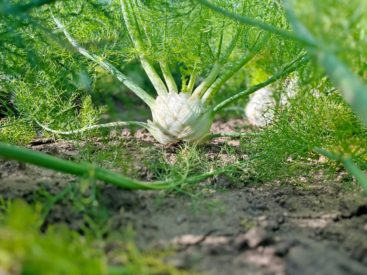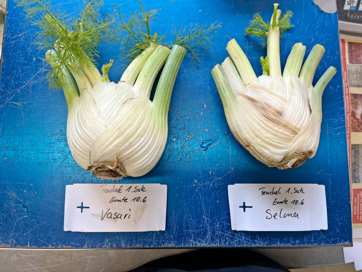 Der zweite Satz Knollenfenchel wurde Mitte Mai gepflanzt und musste sich den hohen Temperaturen des Hochsommers stellen. Dies führte dazu, dass einige Knollen ins Schossen gingen, bevor sie in die Breite wachsen konnten. Der Erntetermin am 17. Juli 2024 wurde etwas zu spät gewählt: Zwar hatten die Pflanzen bis dahin große Knollen ausgebildet, diese gingen jedoch auch vermehrt in die Höhe. Bis zum Erntetermin Mitte Juli gab es im Kulturverlauf des Knollenfenchels an insgesamt 22 Tagen Höchsttemperaturen von über 25 °C, was das Schossen begünstigte.