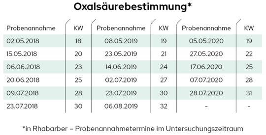 Die Calciumuntersuchung erfolgte nach Aufschluss der getrockneten Proben mittels Mikrowelle (Microwave Digestion System, Microwave ECO, Fa. Anton Paar) mit Salpeter- und Salzsäure. Die Vermessung der Proben erfolgte mittels optischer Emissionsspektrometrie mit induktiv gekoppeltem Plasma an einem ICP-OES (iCAP 6000 Series 6300). Für die Bestimmung der Oxalsäure wurden die homogenisierten Rhabarberbreiproben zum vollständigen Lösen der Calciumoxalat-Hydrat-Kristalle mit Salzsäure erhitzt. Die enzymatische Bestimmung der Oxalsäure erfolgte dann mittels der Testkombination E2100 und E2250 der Fa. r-Biopharm AG E2250 und photometrischen Vermessung mit dem Gerät Gallery Plus der Fa. Thermo Scientific.