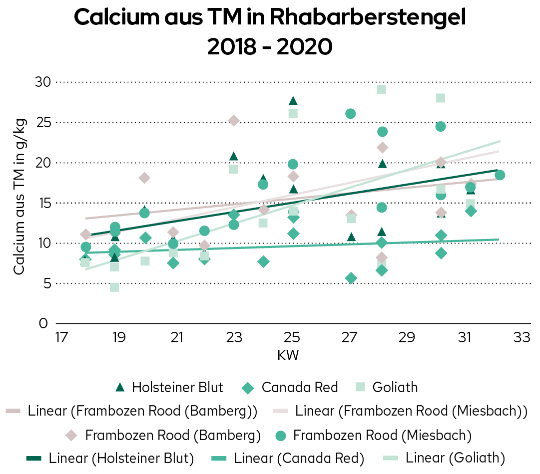 Für die Darstellung der Ergebnisse wurde der Median der drei Untersuchungsjahre verwendet. Die Verwendung des Medians wurde gewählt, um Ausreißer zu eliminieren. Das Element Calcium lag zwischen 4,5 und 29 g/kg TM, im Schnitt bei 13,9 g/kg TM. Die Bestimmtheitsmaße waren sehr gering, was durch die Streuung der Calciumkonzentrationen bedingt war. In allen Sorten stieg die Calciumkonzentration über den Untersuchungszeitraum. Bei der Sorte ‘Goliath’, die den niedrigsten Oxalsäuregehalt hatte, war der Trend des Anstiegs der Calciumkonzentration am stärksten.