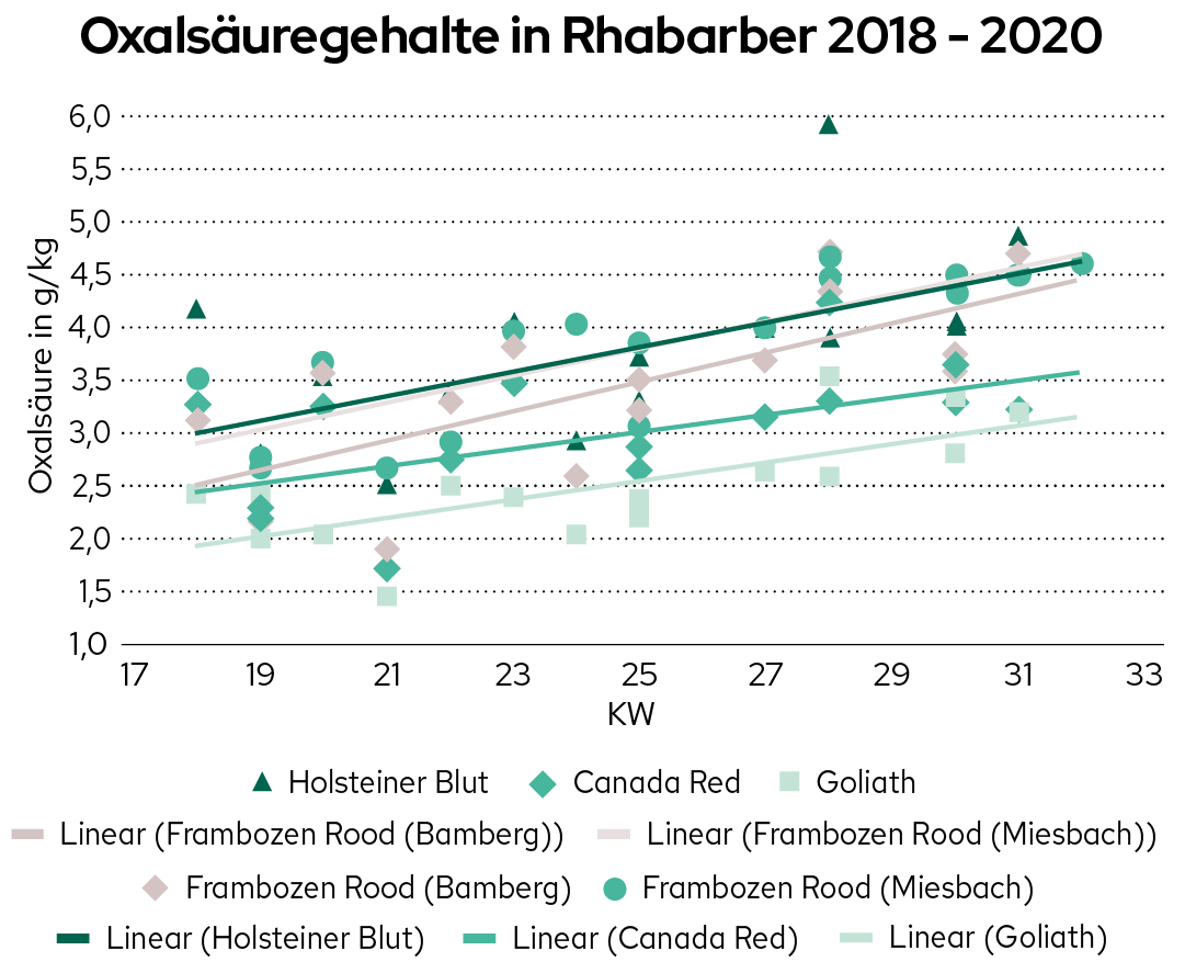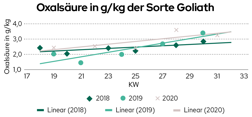 Beim Oxalsäuregehalt zeigten sich deutliche Sortenunterschiede. ‘Goliath’ hatte den niedrigsten und somit gesundheitlich unbedenklichsten Gehalt an Oxalsäure. Bei allen Sorten ergab sich ein Anstieg der Oxalsäurekonzentration mit späteren Ernteterminen.