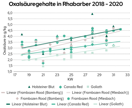Die Sorte ‘Goliath’ wies über alle Jahre hinweg die niedrigsten Gehalte an Oxalsäure auf und zeigte den schwächsten Anstieg der Oxalsäurekonzentration im Verlauf der Saison. Auch ‘Canada Red’ kann noch als Sorte mit niedrigem Gehalt eingestuft werden. Die Sorten ‘Holsteiner Blut’ und ‘Frambozen Rood’ zeigten über alle Jahre hinweg höhere Gehalte an Oxalsäure und einen deutlicheren Anstieg der Oxalsäurekonzentration bei späteren Ernteterminen. Wer also aus gesundheitlichen Gründen zu viel Oxalsäure vermeiden möchte, kann über die Wahl der Rhabarbersorte Einfluss nehmen.