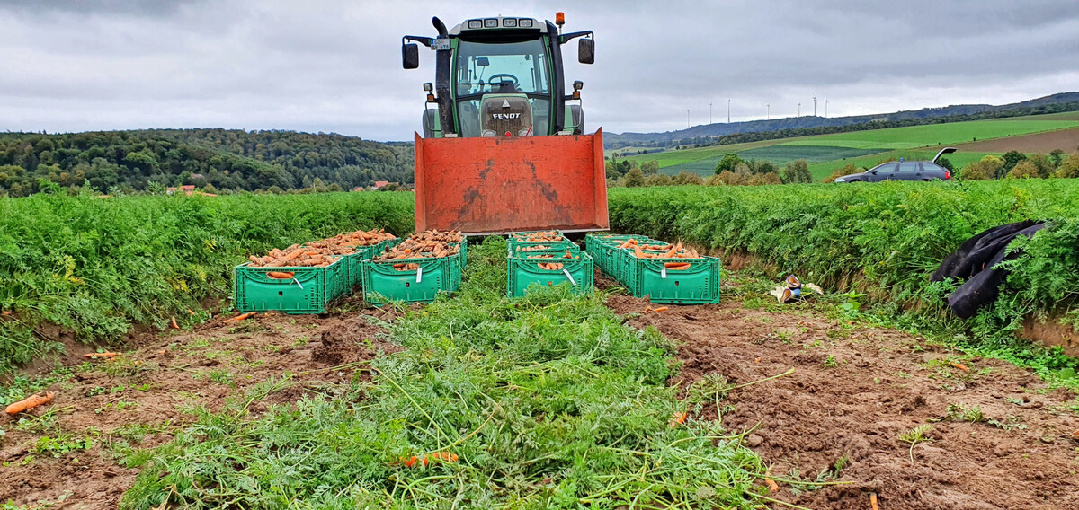 Der Biolandhof Müller-Oelbke liegt in Etzenborn, im südlichen Landkreis von Göttingen. Dort bewirtschaftet die Familie Müller zusammen mit 30 Mitarbeitenden rund 400 ha Fläche, 150 ha entfallen auf Kartoffeln und Sonderkulturen, davon sind 25 ha Möhren. In Zusammenarbeit mit dem Naturland-Berater Holger Buck wurde auf den Flächen des Betriebs ein vierjähriger Versuch zur Qualitätsverbesserung von Lagermöhren durchgeführt. Wir haben mit Johannes Müller darüber gesprochen, welche Chancen er für seinen Betrieb in den On-Farm-Versuchen sieht.
