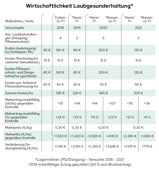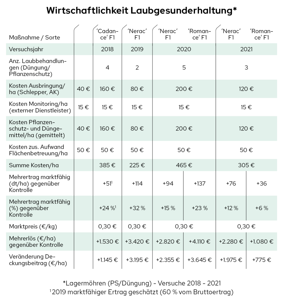 Die Kosten für Personal und Maschinen können im Schnitt mit jeweils 40 Euro/ha und Behandlung beziffert werden. Für Dünge- und Pflanzenschutzmittelaufwendungen sind im Durchschnitt ebenfalls etwa 40 Euro/ha und Behandlung anzusetzen. 15 Euro/ha sind für das externe Pflanzenmonitoring (Bewertung der Gesundheit des Laubs) zu veranschlagen. Ein zusätzlicher Aufwand für die Flächenbetreuung wurde mit 50 Euro/ha angenommen. Damit betrugen die Gesamtkosten aller Maßnahmen zur Gesunderhaltung des Möhrenlaubes über alle Versuchsjahre zwischen 225 und 465 Euro/ha.