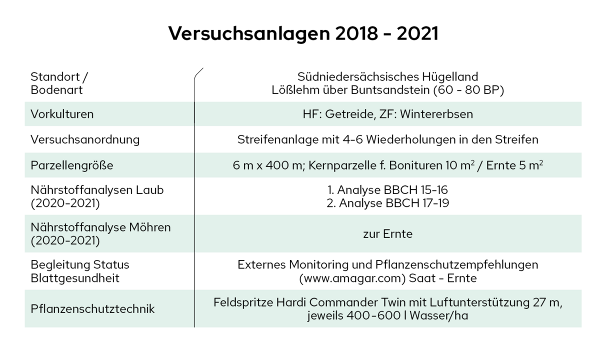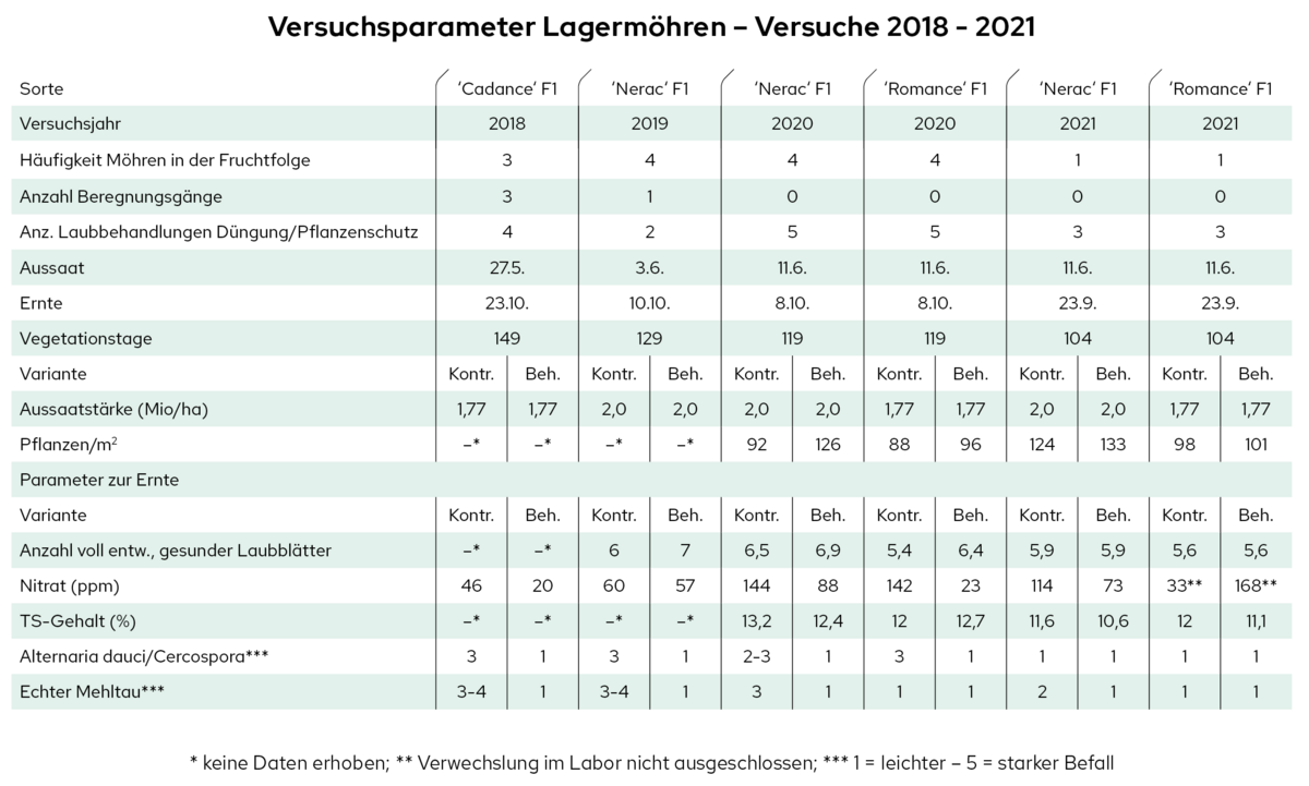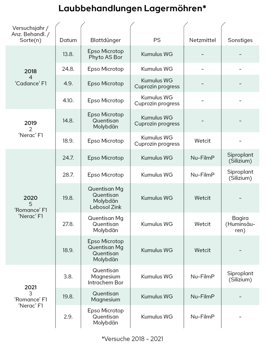 Über alle vier Versuchsjahre war die Behandlungsintensität bei Blattdüngung und Pflanzenschutz mit zwei bis fünf Maßnahmen recht unterschiedlich, ebenso die Möhrenhistorie von einem erstmaligen Möhrenanbau bis hin zum vierten Mal Möhrenanbau auf der jeweiligen Versuchsfläche.