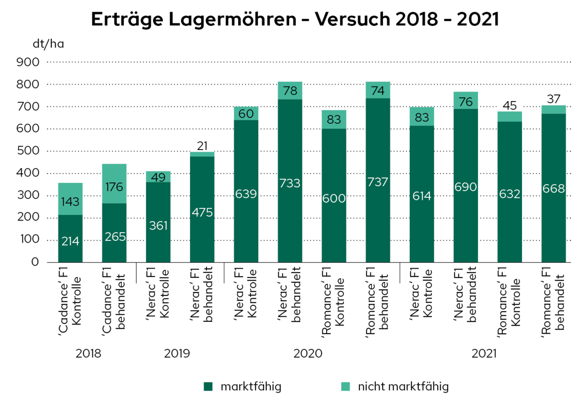 Die Behandlungseffekte waren in allen Versuchsjahren unübersehbar, das Laub der behandelten Varianten zeigte sporadischen bis nur geringeren Schaderregerbefall sowohl bei Echtem Mehltau als auch bei den Blattflecken Alternaria dauci und Cercospora carotae. Ertragsbeeinflussende Blattkrankheiten konnten in allen Jahren effektiv reduziert werden. Ein weiterer positiver Effekt der Behandlungen zeigte sich bei der Ernte: Gesundes und kräftiges Laub erleichtert die Ernte mit dem Klemmbandroder.