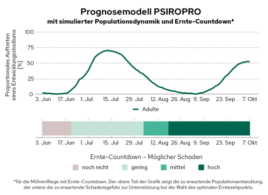 Die Vorhersagemodelle wurden zudem mit Entscheidungshilfen für unterschiedliche Szenarien versehen. Beim Ernte-Countdown werden den Anwendenden die Zeitfenster angezeigt, in denen mit Schäden durch Fraßgänge am Erntegut zu rechnen ist. Je später der Erntetermin liegt, desto größer wird das Risiko für nicht vermarktbare Ware. Der tolerierbare Schaden kann dabei individuell angepasst werden. Für die Verwendung von Netzabdeckungen werden in gleicher Weise Zeitfenster angezeigt, in denen eine Abdeckung zu empfehlen ist, aber auch wann die Abdeckung für andere Kulturmaßnahmen abgenommen werden kann. Der richtige Zeitpunkt beim Einsatz von Pflanzenschutzmittel kann nun genau mit den je nach Pflanzenschutzmittel und Wirkstoff passenden vulnerablen Insektenstadien abgestimmt werden. Flexibel kann dabei auf die betrieblichen Voraussetzungen und die aktuelle Zulassungssituation reagiert werden.